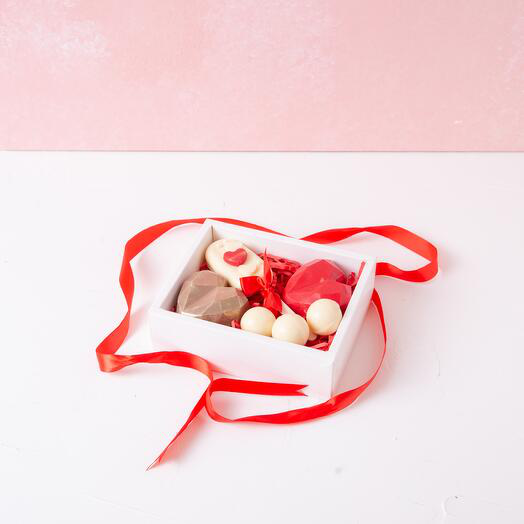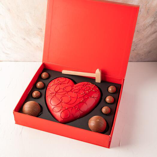 What secrets lie within this futuristic heart? A mouthwatering mix of assorted chocolates and chocolate-covered pretzels along with a personalised card, crafted by yours truly. Encased in a sleek black box, black ribbon packaging, this gift will turn your evening into a dramatic act with a sweet, playful ending.