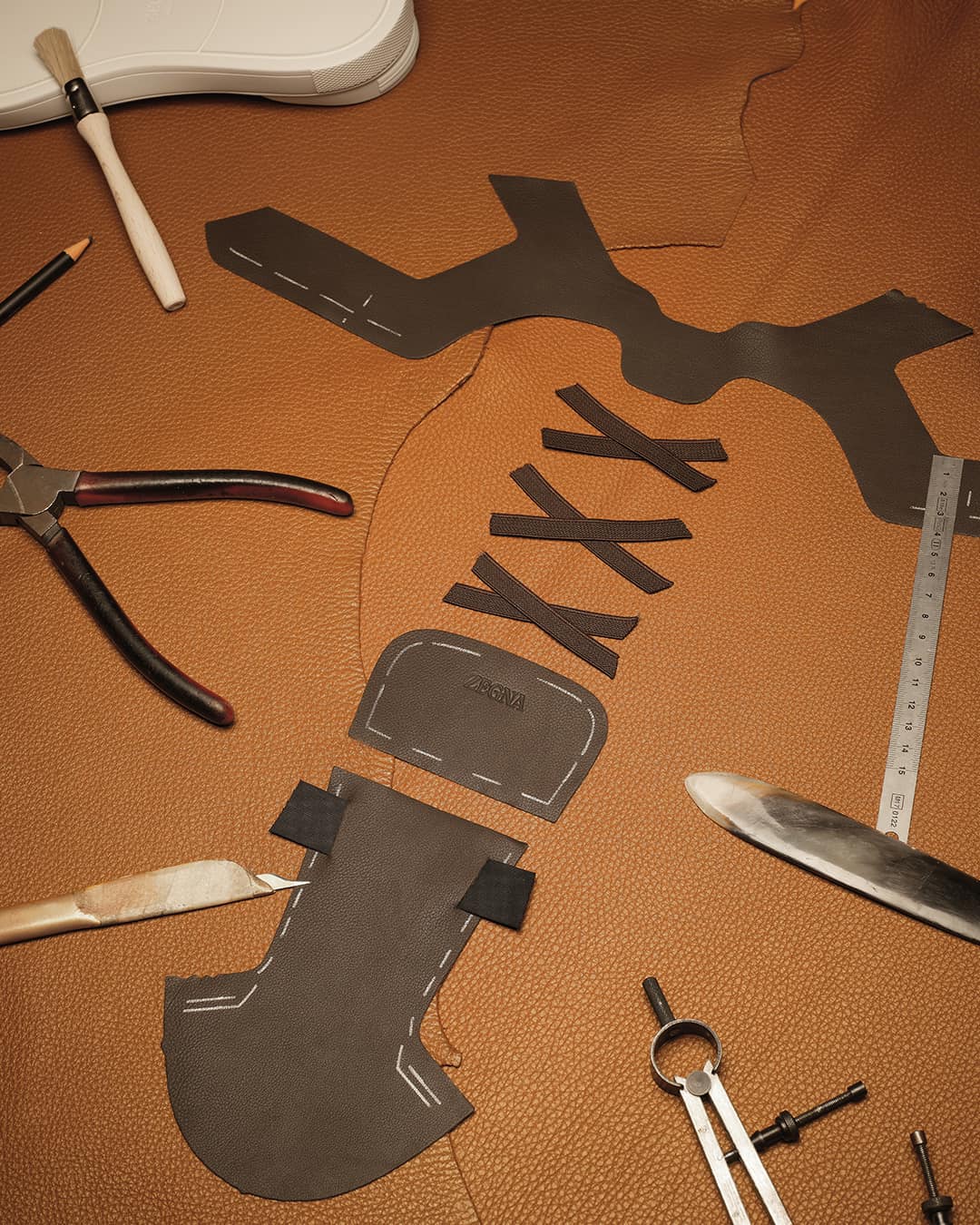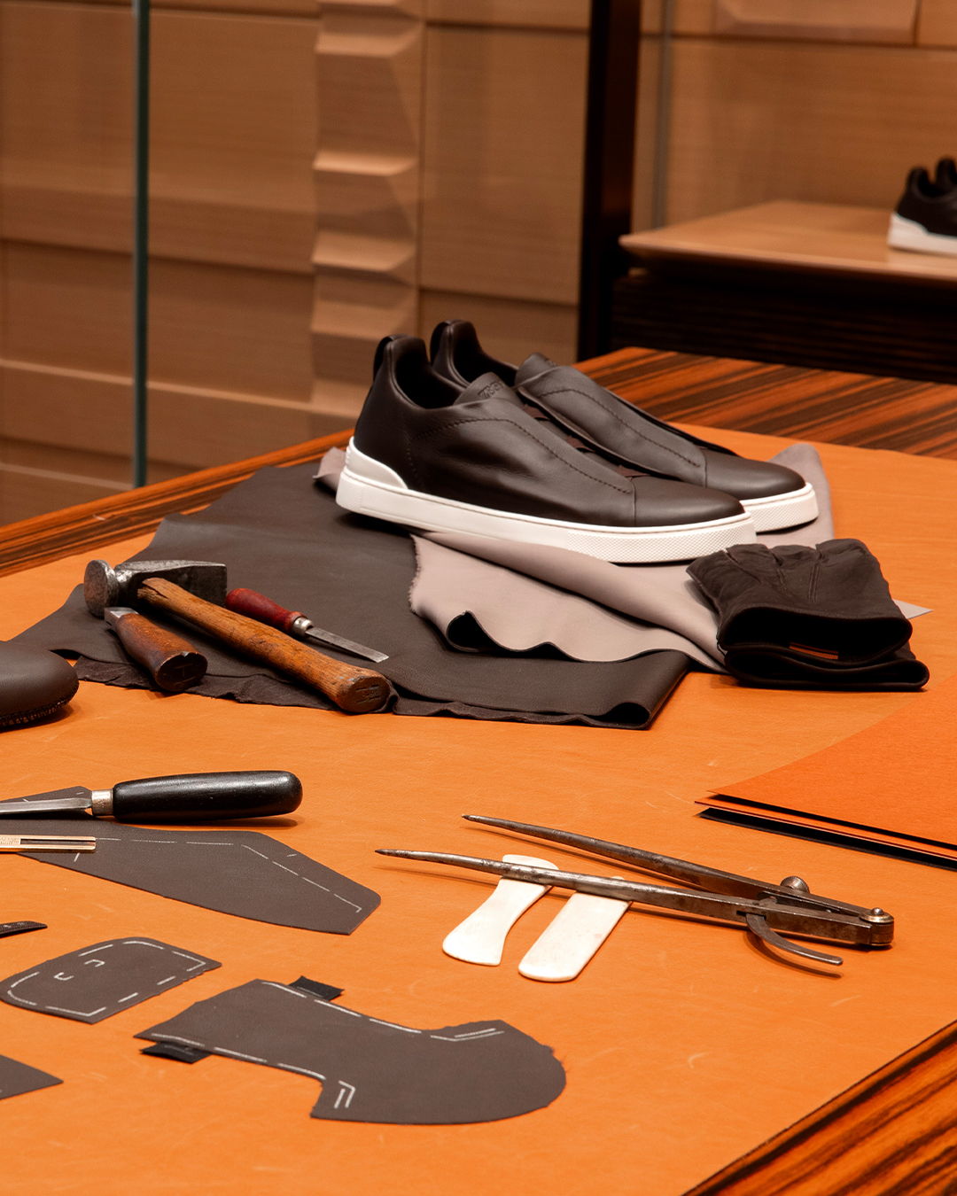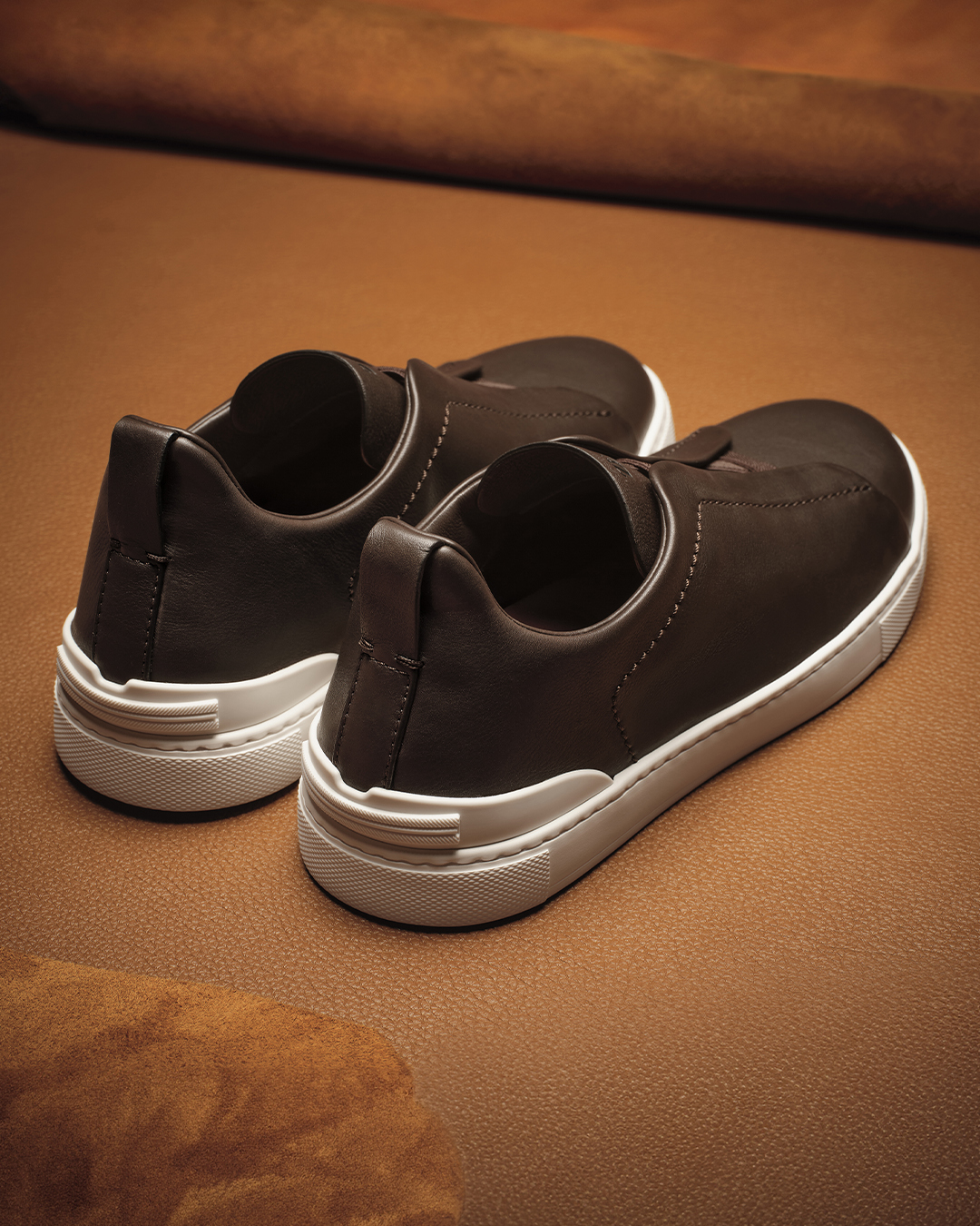 The SECONDSKIN material, originally developed for glove making, found an unexpected application in footwear through Zegna’s unique environment of innovation and artisanal expertise. Each Triple Stitch SECONDSKIN shoe is crafted with the utmost care, using the finest New Zealand calf leather and advanced ovine tanning techniques. This results in a material that is exceptionally soft, lightweight, and resistant to creasing, offering a personalized fit that improves with every wear. In fact, SECONDSKIN's leather thickness is only 0.8mm, each shoe comprises 68 components, and it involves 13 artisans who have undergone 12 months of training to be able to work on the creation of these sneakers.